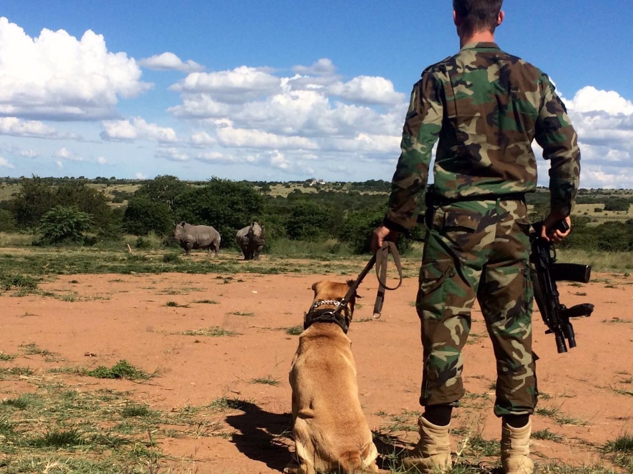Highly specialized armed guards and scent dogs patrol areas around the rhinos to protect them from poachers.