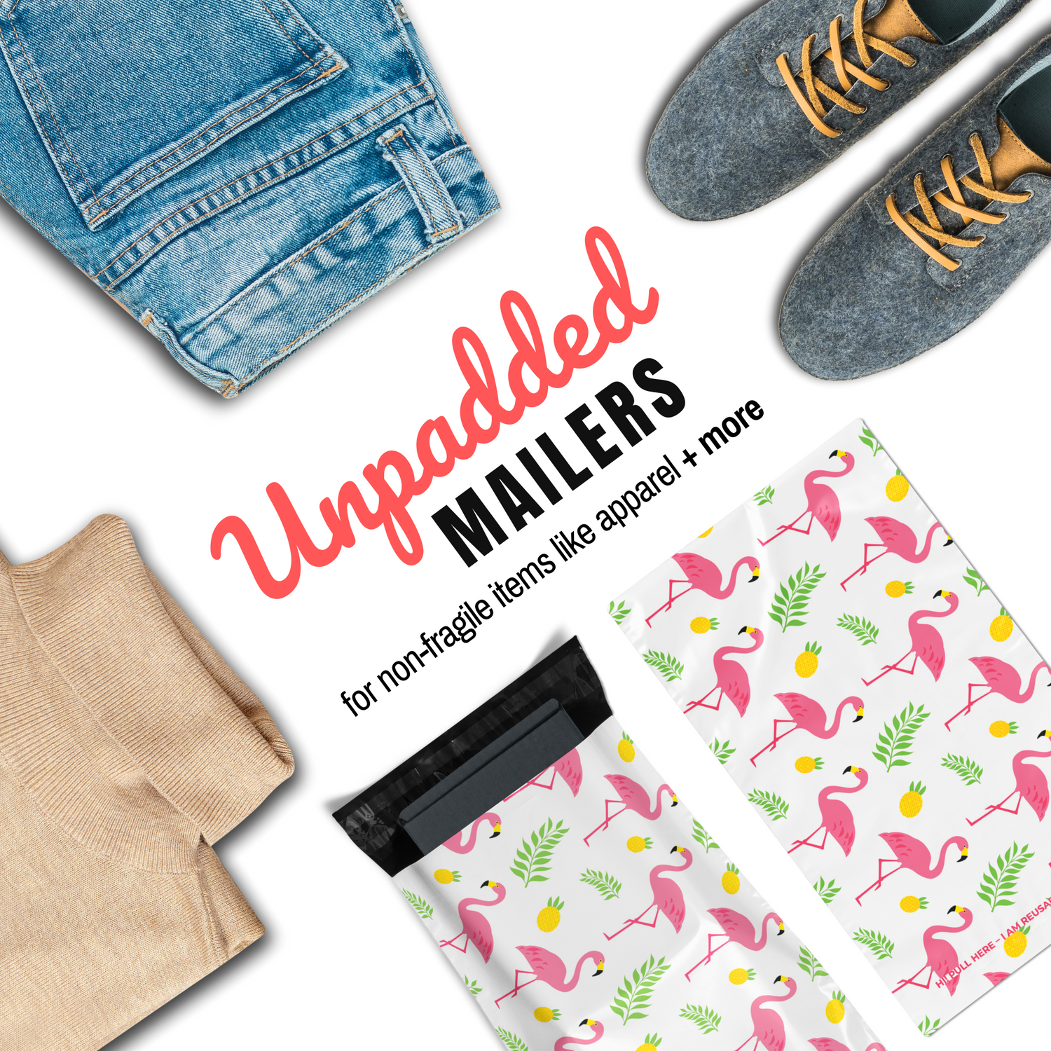 Tropical paradise! These tropical flamingo-themed eco-friendly reusable mailing bags are waterproof, tear-resistant, non-see-through, have an easy-open pull tab, and are equipped with a second, reusable seal perfect for customer returns. Our durable shipping envelopes are designed to exceed your postage needs.