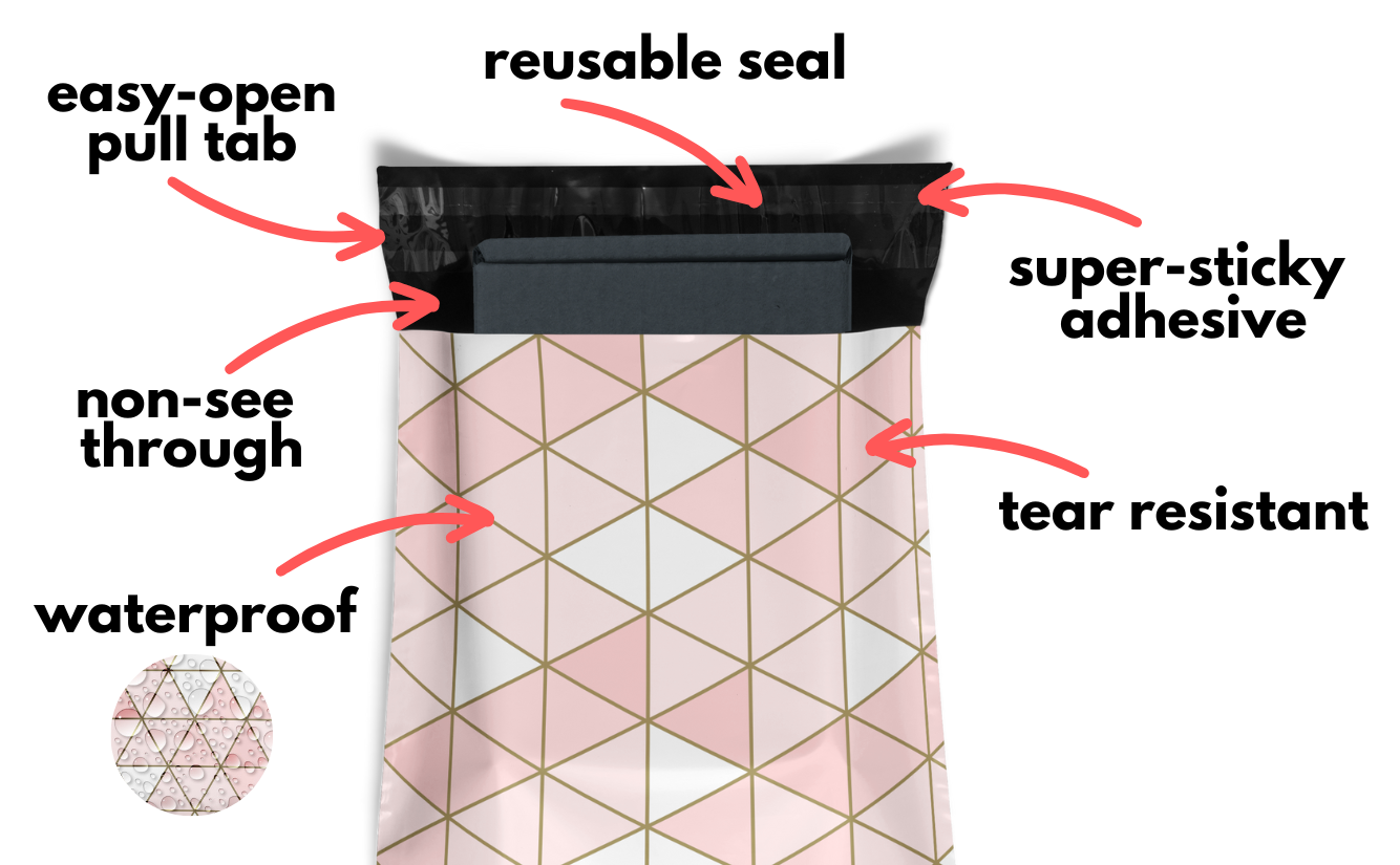 Light-reflecting gold. These art-deco-inspired reusable mailing bags are waterproof, tear-resistant, non-see-through, have an easy-open pull tab, and are equipped with a second, reusable seal perfect for customer returns. Our durable shipping envelopes are designed to exceed your postage needs.