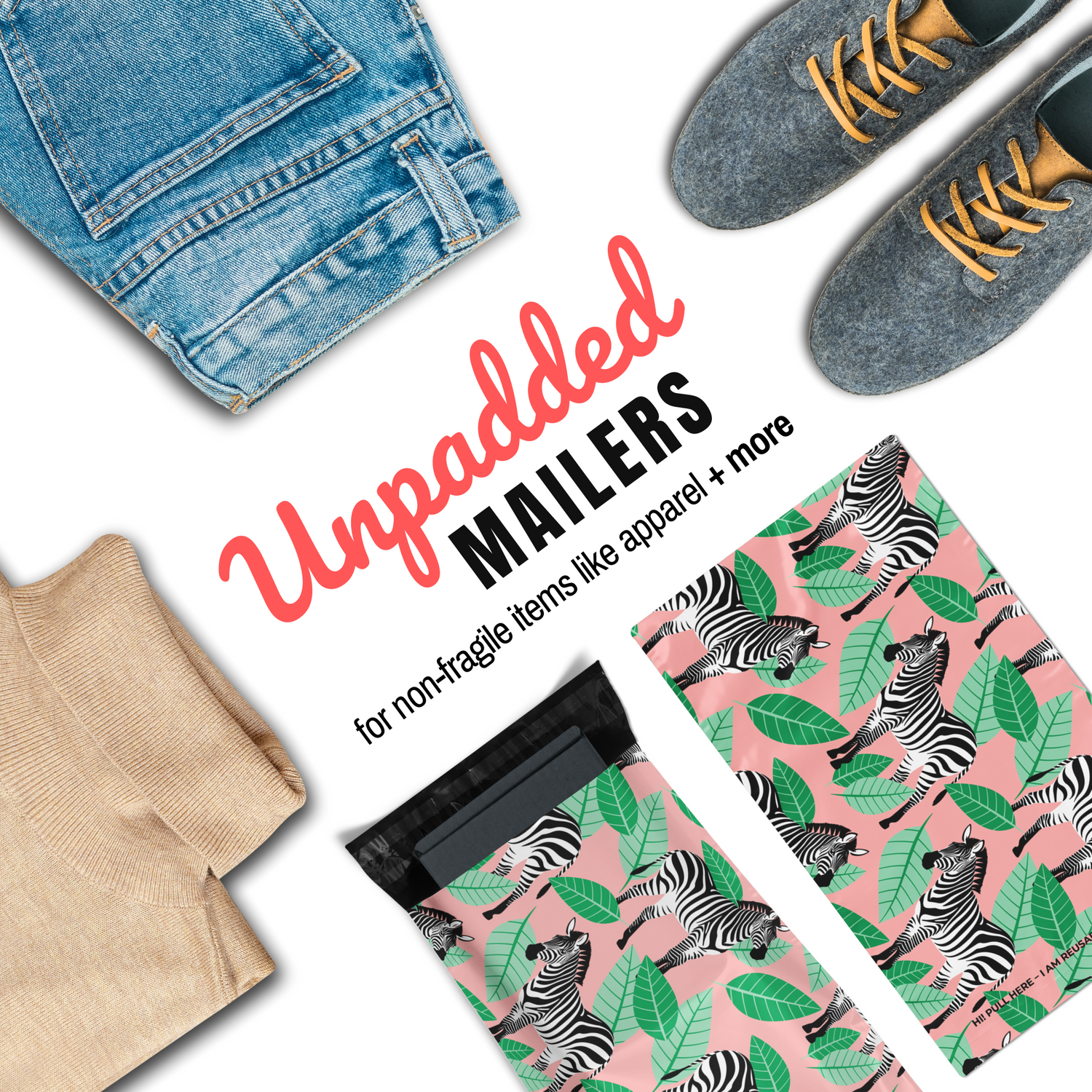 Wild & Exotic. These zebra-themed eco-friendly reusable mailing bags are waterproof, tear-resistant, non-see-through, have an easy-open pull tab, and are equipped with a second, reusable seal perfect for customer returns. Our durable shipping envelopes are designed to exceed your postage needs.