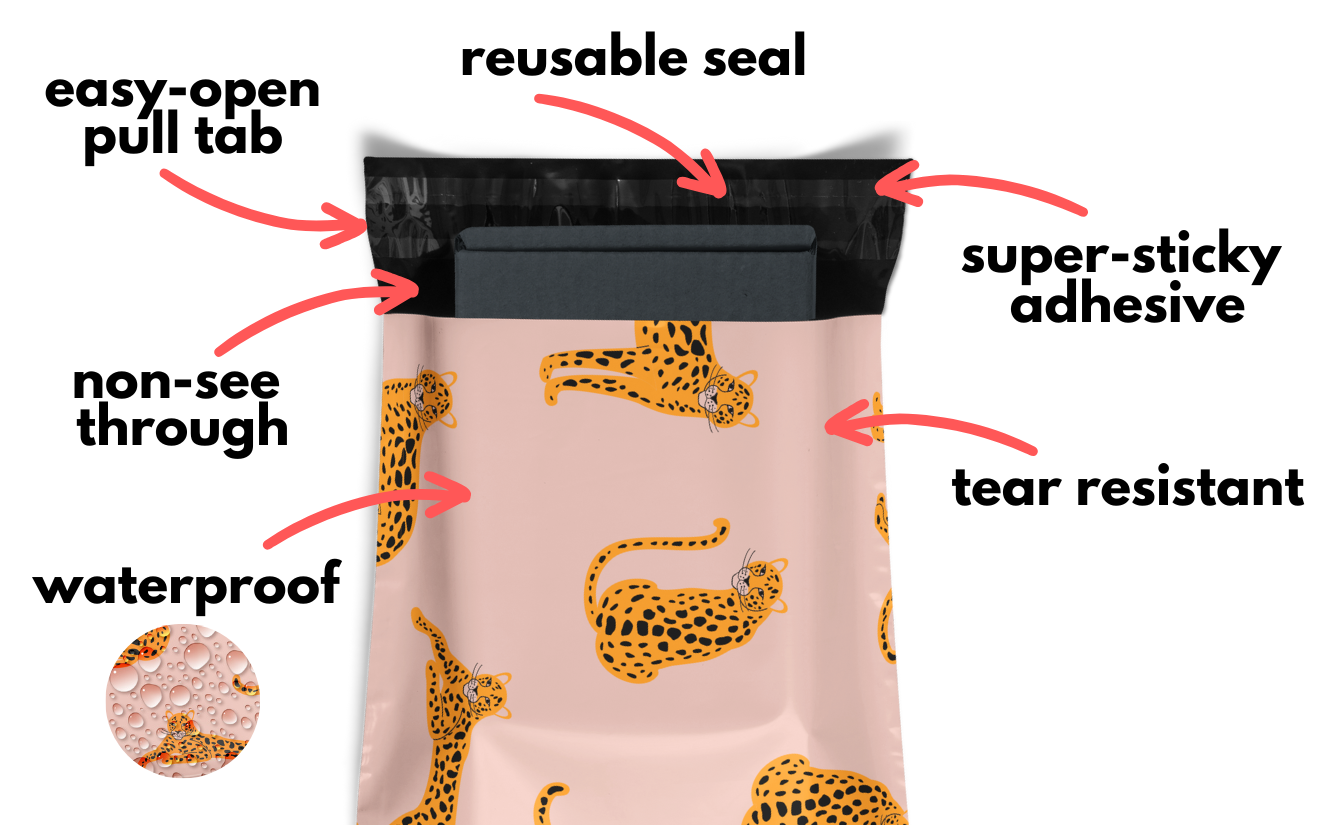Our #1 seller! These leopard-themed eco-friendly reusable mailing bags are waterproof, tear-resistant, non-see-through, have an easy-open pull tab, and are equipped with a second, reusable seal perfect for customer returns. Our durable shipping envelopes are designed to exceed your postage needs.